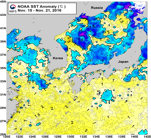 NOAA 위성영상 표면수온 평년편차 분포도 (2016. 11. 15 ~ 2016. 11. 21)