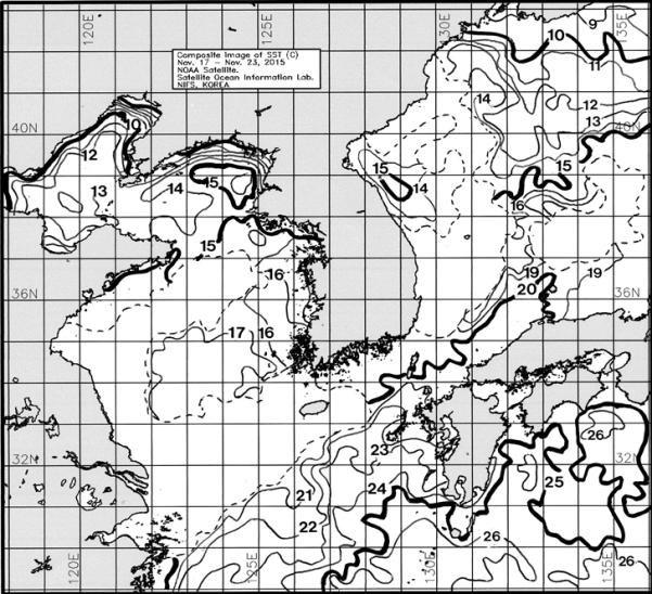 광역 위성영상 합성 표면수온 분포도 (2015. 11. 17 ~ 2015. 11. 23)