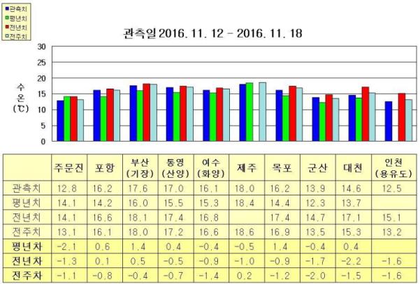 ◦ 금주(2016.11.27~2016.12.03)의 한반도 연안 표면수온은 동해 연안역에서 섭씨 12.0~17도, 남해 연안역에서 15.0~17도, 서해 연안역에서 12.0~15도 내외로 예상됩니다. ◦ 평년에 비해 동해연안역은 주문진 1도 낮음을 제외하고 1.5~2도 높게, 제주 2도 낮음을 제외한 남해 연안역은 비슷하게, 서해 연안역은 2~3도 높게 나타날 것으로 예상됩니다. ◦전년에 비해 동해 연안역은 주문진 1도 낮음을 제외하고 비슷하게, 남해 연안역은 1~2도 낮게, 군산 0.5도 높음, 인천 비슷함을 제외한 서해 연안역은 1도 높게 나타날 것으로 예상됩니다.