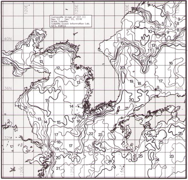 1. 12월의 연근해수온분포 1) 연안수온분포 전국 연안정지관측 수온은 월평균 7.5~16.1°C 범위의 분포를 보였다. 동해연안 주문진, 포항의 월평균 수온은 11.4~11.7℃로 평년에 비해 0.6~0.7°C의 고온현상을 보였다. 남해연안 부산, 통영, 여수의 월평균 수온은 12.0~16.1°C로, 평년에 비해 0.7~1.5°C의 고온현상을 보였다. 제주도의 수온은 16.1°C로서, 평년과 비슷한 수온현상을 보였다. 서해연안 목포, 군산의 월평균 수온은 9.5~12.6°C로 평년에 비해 3.0~3.3°C의 고온 현상을 보였다. 인천의 수온은 7.5°C로 평년에 비해 0.2°C의 저온현상을 보였다. 2) 근해수온분포 인공위성 관측 자료로 2016년 12월 1일부터 20일까지 합성한 우리나라 주변해역 표면수온분포도를 보면(그림 1), 동해 연근해역은 17~20°C로 평년(15~18℃)에 비하여 1~2℃ 범위의 높은 수온분포를 보였다. 대화퇴 근해는 14~16°C, 울릉도 연근해는 17~18°C의 분포를 보였다. 남해 연근해역은 14~22°C로 평년(14~20℃)에 비해 1~2℃ 범위의 높은 수온분포를 보였다. 대마도 연근해는 20~22°C, 제주도 연근해는 19~22°C의 분포를 보였다. 서해 연근해역은 9~14°C로 평년(10~13℃)에 비해 1℃ 내외의 높은 수온분포를 보였다. 어청도 연근해는 13~14°C의 분포를 보였다. 2. 2017년 1월 예측 2017년 1월의 연안 월평균 수온은 동해가 7~14℃로 평년에 비해 1~2℃ 범위의 높은 수온분포를 보이겠고, 남해가 10~14℃로 평년에 비해 1℃ 내외 높게, 서해는 1~7℃로 평년과 비슷한 수온분포를 보일 것으로 전망된다. 그림 1. 2016년 12월 1~20일까지 합성한 위성관측 표면수온분포도.