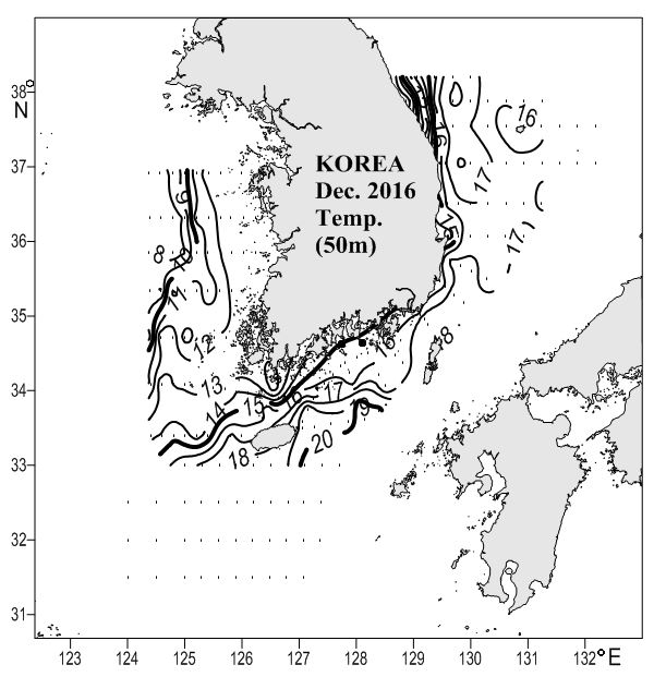 우리나라 연근해 수심 50m층의 수평수온분포는, 서해의 경우 7~13℃ 범위로 분포하였고, 남해는 12~20°C 범위로, 동해는 10~17°C 범위로 분포하였다. 평년에 비해 동해와 남해에서는 일부해역을 제외하고 대부분의 해역에서 1~5℃ 범위의 고온현상을 보였고, 서해의 연안역을 포함한 대부분의 조사해역에서는 1~2℃ 범위의 고온현상을 보였고, 외해역에서 1~2℃ 범위의 저온현상을 보였다.(그림 2, 3).