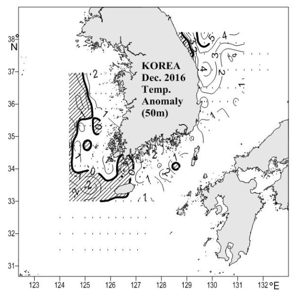 그림 4. 2016년 12월 308선 연직수온 및 평년편차도 (빗금영역은 평년보다 낮은 수온해역)