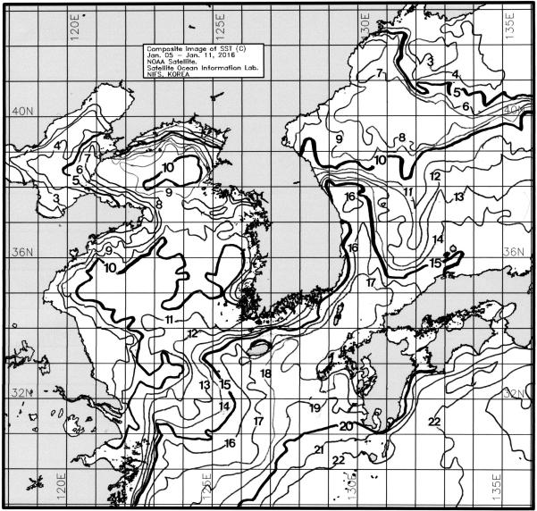 ◦「작년에 비해」 대화퇴 근해 2.5도 높게, 울릉도-독도 근해 2도 높게, 대마도 근해 3도 높게, 제주도 1.5도 높게, 이어도 근해 2도 높게, 가거초 0.5도 높게, 어청도 근해 2도 높게, 백령도 2도 높게 나타날 것으로 예상됩니다. 광역 위성영상 합성 표면수온 분포도 (2016. 01. 05 ~ 2016. 01. 11)