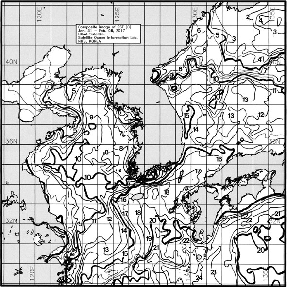 ◦ 금주(2017.2.12~2017.2.18)의 한국근해 표면수온은 대화퇴 근해 섭씨 5~7도, 울릉도-독도 근해 10~11도, 대마도 근해 15~16도, 제주도 근해 15~16도, 이어도 근해 10~11도, 가거초 근해 8~9도, 어청도 근해 5~6도, 백령도 근해 5∼6도 내외로 예상됩니다.