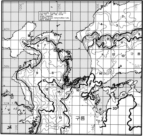 ◦「작년에 비해」 대화퇴 근해 4도 낮게, 울릉도-독도 근해 1도 낮게, 대마도 근해 1도 높게, 제주도 1도 높게, 이어도 근해 0.5도 높게, 가거초 3도 낮게, 어청도 근해 1도 낮게, 백령도 비슷하게 나타날 것으로 예상됩니다. 광역 위성영상 합성 표면수온 분포도 (2016. 02. 02 ~ 2016. 02. 08)