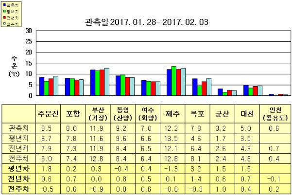 ◦ 금주(2017.2.12~2017.2.18)의 한반도 연안 표면수온은 동해 연안역에서 섭씨 7.5~12.0도, 남해 연안역에서 7.0~12.5도, 서해 연안역에서 0.5~6.0도 내외로 예상됩니다. ◦ 평년에 비해 주문진 1도 높음을 제외한 동해 연안역은 비슷하게, 여수 비슷함을 제외한 남해 연안역은 0.5~1.0도 낮게, 군산 비슷함을 제외한 서해 연안역은 0.5~1.5도 높게 나타날 것으로 예상됩니다. ◦전년에 비해 부산(기장) 0.5도 높음을 제외한 동해 연안역은 비슷하게, 제주 1.5도 낮음을 제외한 남해 연안역은 0.5~1.0도 낮게, 비슷함을 제외한 서해 연안역은 0.5~1.5도 낮게 나타날 것으로 예상됩니다. |
