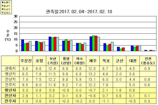 ◦ 금주(2017.2.19~2017.2.25)의 한반도 연안 표면수온은 동해 연안역에서 섭씨 8.5~12.0도, 남해 연안역에서 7.5~13.0도, 서해 연안역에서 2.0~7.0도 내외로 예상됩니다. ◦ 평년에 비해 포항 비슷함을 제외한 제외한 동해 연안역은 0.5~2.5도 높게, 남해 연안역은 비슷하게, 군산 비슷함을 제외한 서해 연안역은 1.0~2.0도 높게 나타날 것으로 예상됩니다. ◦전년에 비해 포항 비슷함을 제외한 동해 연안역은 1.0~3.0도 높게, 여수 비슷함을 제외한 남해 연안역은 0.5~1.5도 높게, 목포 0.5도 높음, 대천 비슷함을 제외한 서해 연안역은 1.0~2.0도 낮게 나타날 것으로 예상됩니다. |