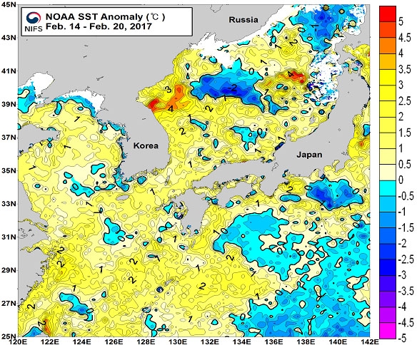 광역 위성영상 합성 표면수온 분포도 (2017. 02. 14 ~ 2017. 02. 20) ◦「평년에 비해」 대화퇴 근해 비슷하게, 울릉도-독도 근해 1.5도 높게, 대마도 근해 1도 높게, 제주도 근해 1도 높게, 이어도 근해 0.5도 높게, 가거초 근해 비슷하게, 어청도 1도 높게 나타날 것으로 예상됩니다. NOAA 위성영상 표면수온 평년편차 분포도 (2017. 02. 14 ~ 2017. 02. 20)