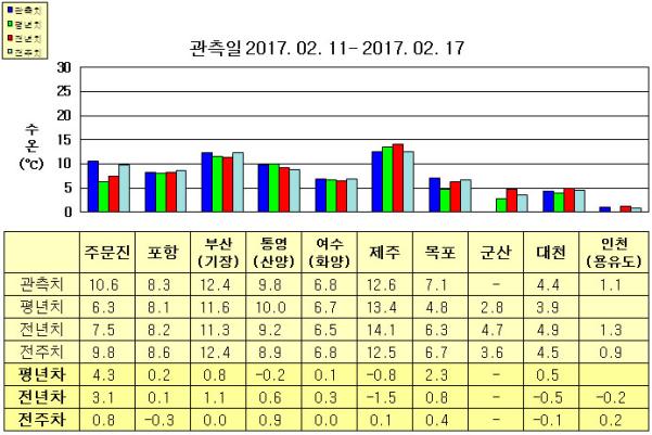 ◦ 금주(2017.2.26~2017.3.4)의 한국근해 표면수온은 대화퇴 근해 섭씨 6~8도, 울릉도-독도 근해 11~12도, 대마도 근해 15~16도, 제주도 근해 15~16도, 이어도 근해 9~11도, 가거초 근해 8~10도, 어청도 근해 5~7도, 백령도 근해 4∼5도 내외로 예상됩니다.