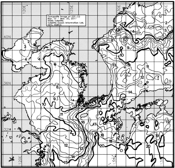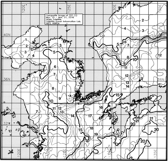 ◦「작년에 비해」 대화퇴 근해 3.5도 낮게, 울릉도-독도 근해 0.5도 낮게, 대마도 근해 1도 높게, 제주도 근해 비슷하게, 이어도 근해 0.5도 높게, 가거초 0.5도 높게, 어청도 근해 비슷하게, 백령도 0.5도 낮게 나타날 것으로 예상됩니다. 광역 위성영상 합성 표면수온 분포도 (2016. 03. 15 ~ 2016. 03. 21)