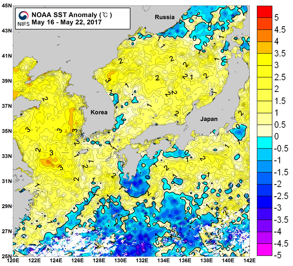 ○「평년에 비해」 대화퇴 근해 2도 높게, 울릉도-독도 1도 높게, 대마도 1도 높게, 제주도 근해 1도 높게, 이어도 근해 3도 높게, 가거초 근해 2도 높게, 어청도 근해 2.5도 높게 나타날 것으로 예상됩니다. NOAA 위성영상 표면수온 평년편차 분포도 (2017. 05. 16 ~ 2017. 05. 22) ※ 위 그림은 NOAA 위성에서 관측한 한반도 주변해역 표면수온 영상의 평년(1990-2016년) 에 대한 편차 분포를 나타냅니다.
