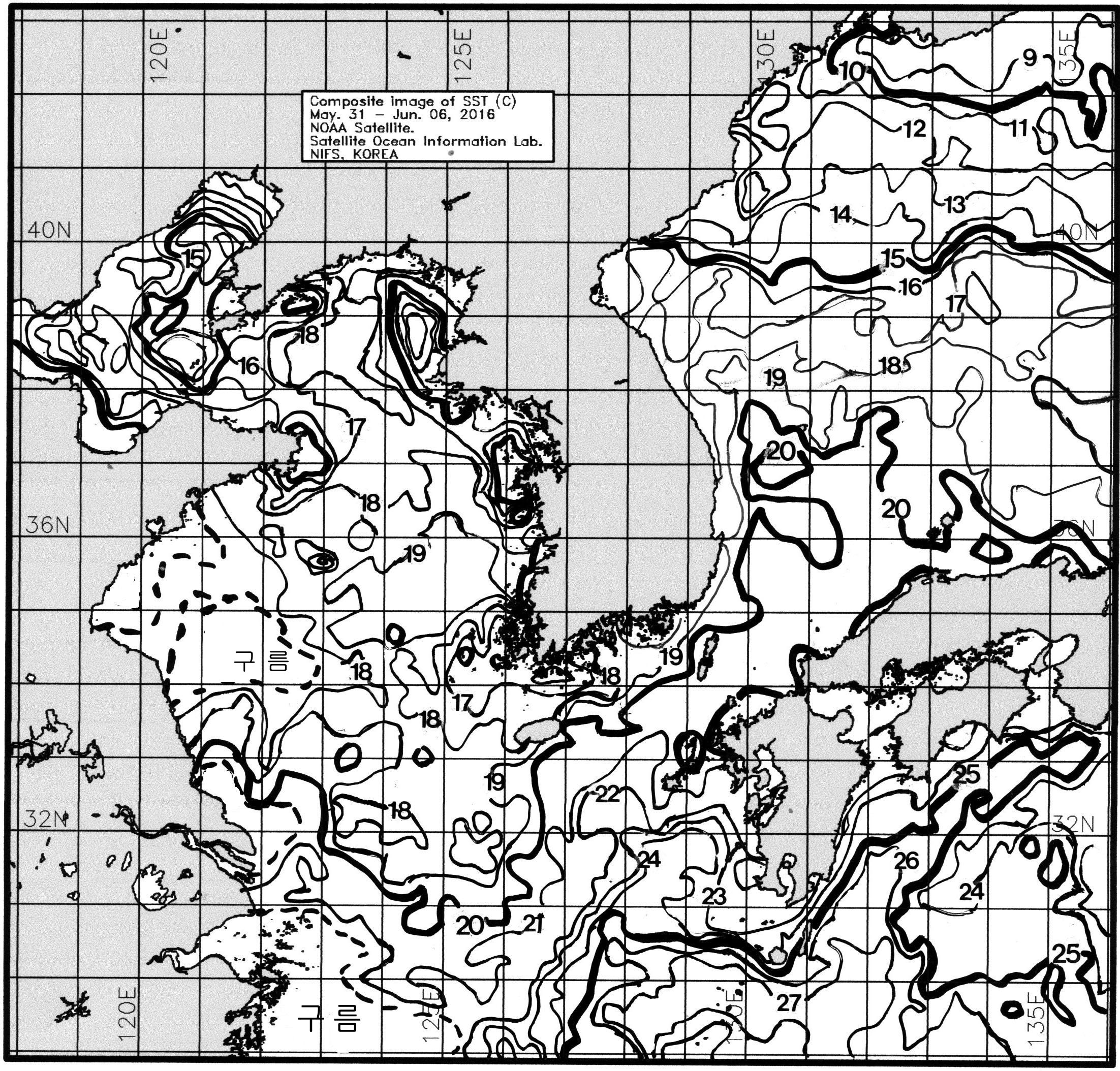 ○수온 전선대는 제주해협 -대한해협 근해를 걸쳐 수온 19도를 중심으로, 울릉도 북부-대화퇴 근해를 걸쳐 수온 16도를 중심으로 형성 될 것으로 예상됩니다.광역 위성영상 합성 표면수온 분포도 (2017. 05. 16 ~ 2017. 05. 22)