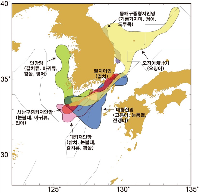 5월의 대형선망어업은 제주 주변해역에서 전갱이(39%), 고등어(25%), 갈치(20%), 몽치다래(9%) 등을 대상으로 조업하였고, 전체적인 어황은 부진하였다. 6월에 들면 대형선망어업은 고등어, 전갱이, 눈퉁멸, 갈치 등을 대상으로 제주 주변해역~대마도 주변해역에 걸쳐 어장이 형성되겠다. 전체적인 어황은 평년수준 또는 평년비 부진할 것으로 전망된다. ○ 멸치어업 5월의 멸치어업은 기선권현망어업에서 조업금지기간(4.1~6.30)이 지속되었고, 남해동부해역에서 자망어업에 의한 어황은 평년수준이었다. 6월에 들면, 남해도~기장연안으로 산란을 위해 내유하는 어군을 대상으로 자망어업에 의한 어장이 형성되겠다. 전체적인 어황은 평년수준으로 전망된다.