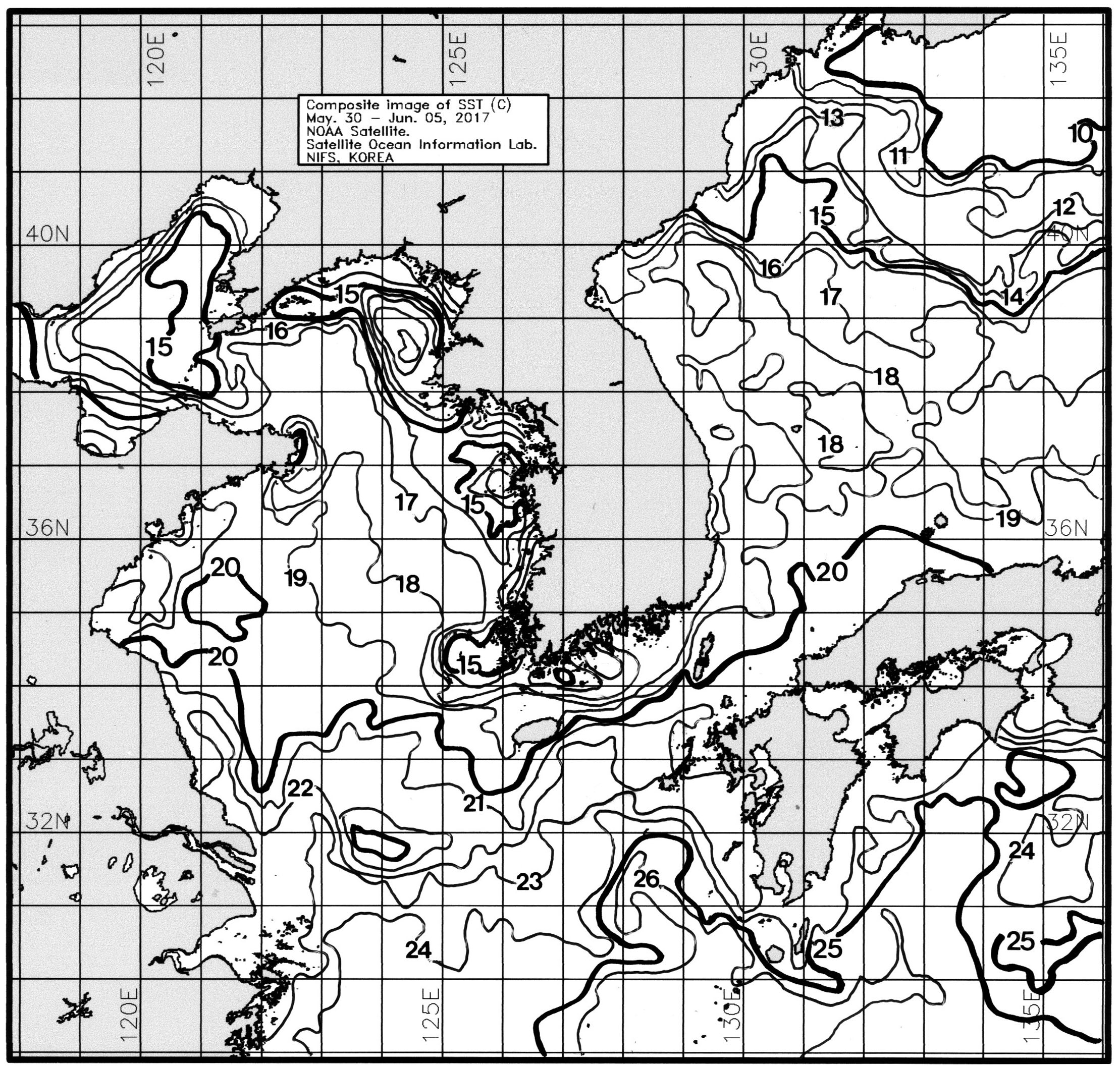 - 금주(2017.6.11~2017.6.17)의 한국근해 표면수온은 대화퇴 근해 섭씨 16~18도, 울릉도-독도 근해 18~20도, 대마도 근해 20~21도, 제주도 근해 21~23도, 이어도 근해 23~24도, 가거초 근해 18~19도, 어청도 근해 17~19도, 백령도 근해 14∼15도 내외로 예상됩니다. - 수온 전선대는 제주해협-대한해협 근해를 걸쳐 수온 19도를 중심으로, 울릉도 북부-대화퇴 근해를 걸쳐 수온 20도를 중심으로 형성 될 것으로 예상됩니다.