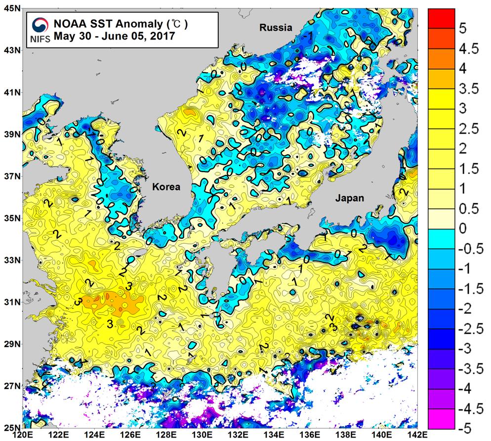 - 「평년에 비해」 대화퇴 근해 0.5도 낮게, 울릉도-독도 0.5도 낮게, 대마도 0.5도 낮게, 제주도 근해 1.5도 높게, 이어도 근해 2도 높게, 가거초 근해 1도 낮게, 어청도 근해 0.5도 낮게 나타날 것으로 예상됩니다. NOAA 위성영상 표면수온 평년편차 분포도 (2017. 05. 30~ 2017. 06. 05) ※ 위 그림은 NOAA 위성에서 관측한 한반도 주변해역 표면수온 영상의 평년(1990-2016년) 에 대한 편차 분포를 나타냅니다.