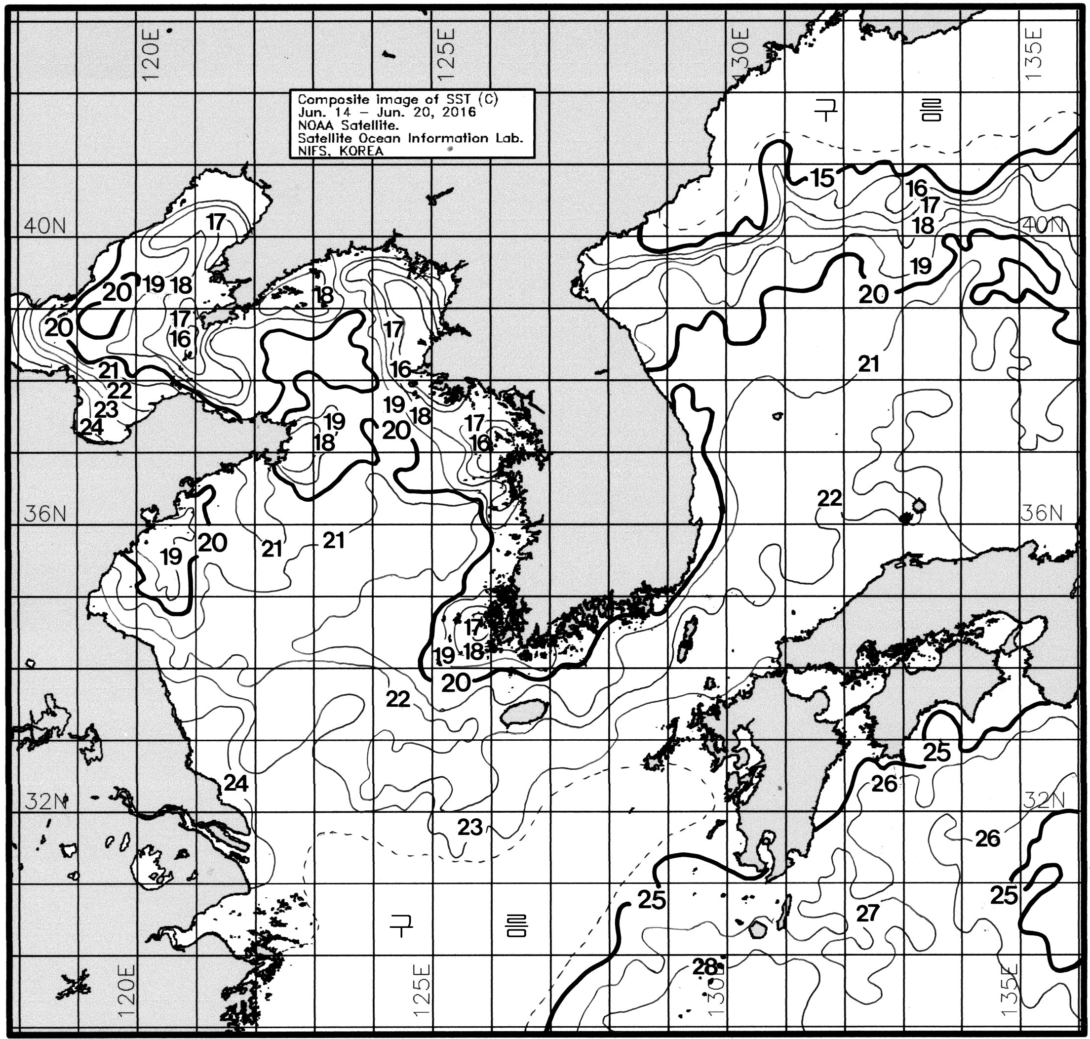 -「작년(2016. 06. 14 ~ 2016. 06. 20)에 비해」 대화퇴 근해 2.5도 낮게, 울릉도-독도 근해 2.5도 낮게, 대마도 근해 2도 낮게, 제주도 근해 0.5도 높게, 이어도 근해 비슷하게, 가거초 1도 낮게, 어청도 2도 낮게, 백령도 근해 1도 낮게 나타날 것으로 예상됩니다. 광역 위성영상 합성 표면수온 분포도 (2016. 06. 14 ~ 2016. 06. 20)