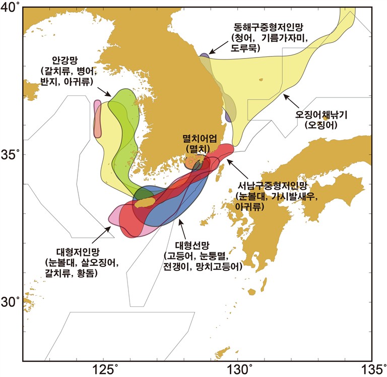 ○ 대형선망어업 6월의 대형선망어업은 제주 주변해역~남해 동부해역에 걸쳐 전갱이(55%), 고등어(22%), 갈치(17%), 창꼴뚜기(2%) 등을 대상으로 조업하였고, 전체적인 어황은 부진하였다. 7월에 들면 대형선망어업은 고등어, 망치고등어, 전갱이, 삼치 등을 대상으로 제주 주변해역~대마도 주변해역에 걸쳐 어장이 형성되겠다. 전체적인 어황은 평년수준 또는 평년비 부진할 것으로 전망된다. ○ 멸치어업 6월의 멸치어업은 주로 자망어업이 동해 남부해역에서 조업하였고, 전체적인 어획량은 평년수준을 나타내었다. 7월에 들면 권현망어업이 금어기(4~6월)를 끝내고 조업을 재개하겠으며, 동해 남부 연안에서도 자망어업에 의해 일부조업이 중순까지 이어지겠다. 전체적인 어황은 평년수준을 보일 것으로 예상된다.