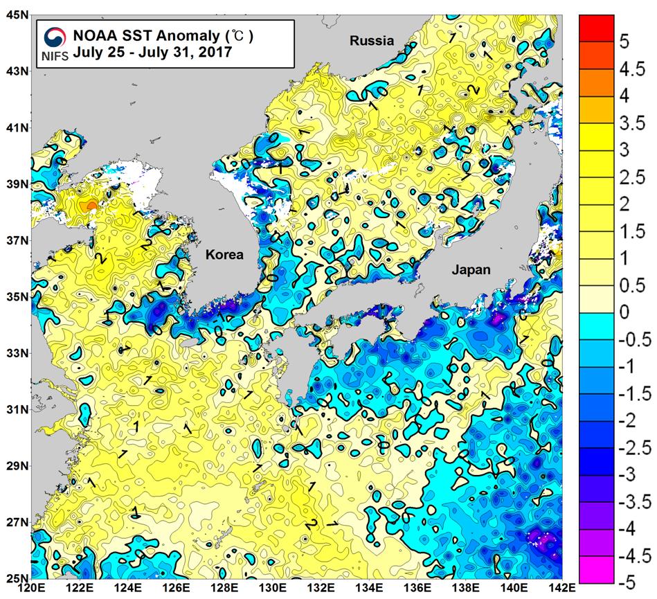 ○ 「평년에 비해」 대화퇴 근해 1.8도 높게, 울릉도-독도 0.5도 높게, 대마도 1도 높게, 제주도 근해 1도 높게, 이어도 근해 2도 높게, 가거초 근해 1도 낮게, 어청도 근해 1도 낮게 나타날 것으로 예상됩니다. NOAA 위성영상 표면수온 평년편차 분포도 (2017. 07. 25 ~ 2017. 07. 31)