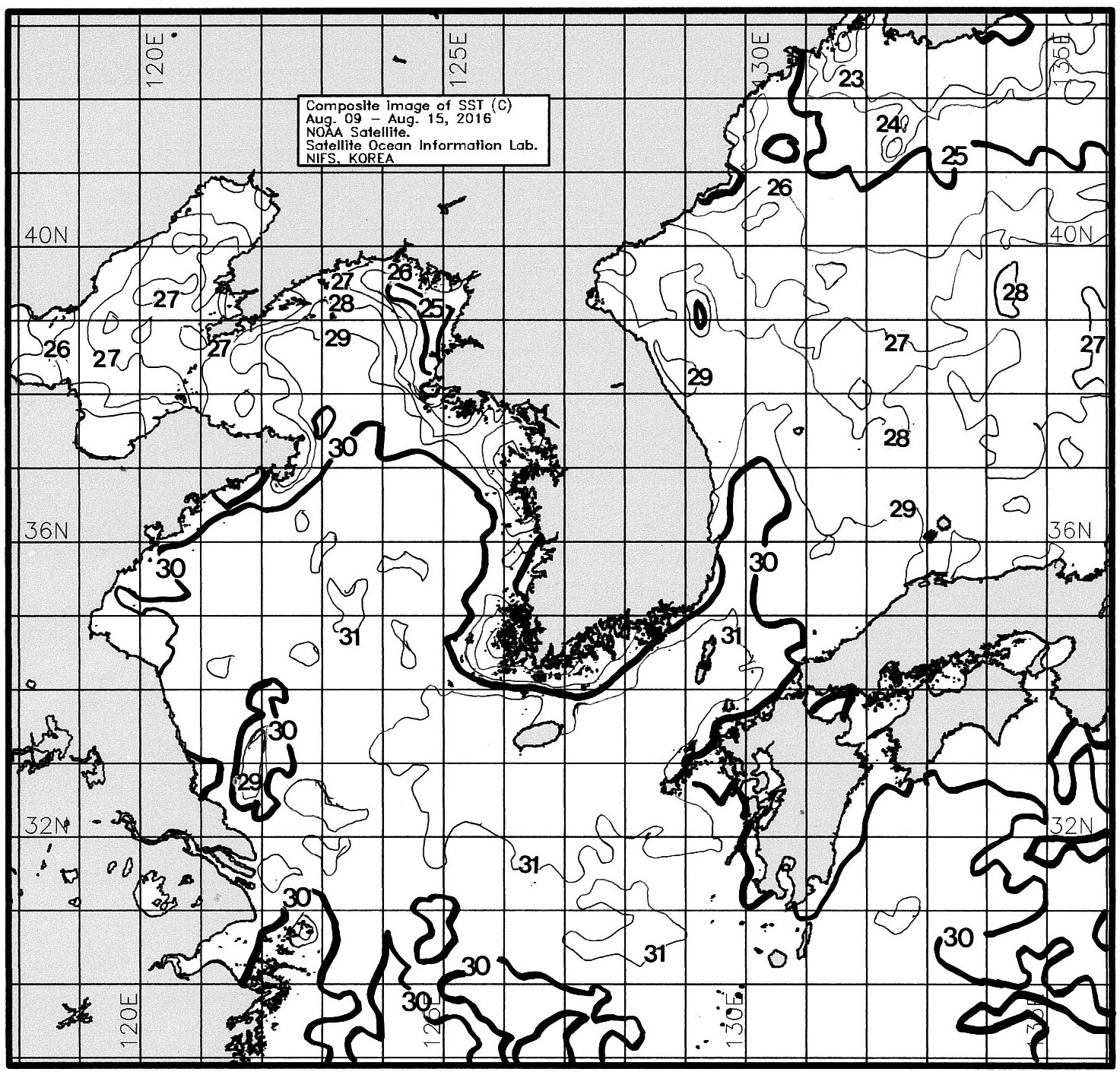 ○ 「작년(2016. 08. 09 ~ 2016. 08. 15)에 비해」 대화퇴 근해 비슷하게, 울릉도-독도 근해 1.5도 낮게, 대마도 2도 낮게, 제주도 근해 2.5도 낮게, 이어도 근해 1도 낮게, 가거초 4도 낮게, 어청도 3.5도 낮게, 백령도 근해 1.5도 높게 나타날 것으로 예상됩니다. 광역 위성영상 합성 표면수온 분포도 (2016. 08. 09 ~ 2016. 08. 15)