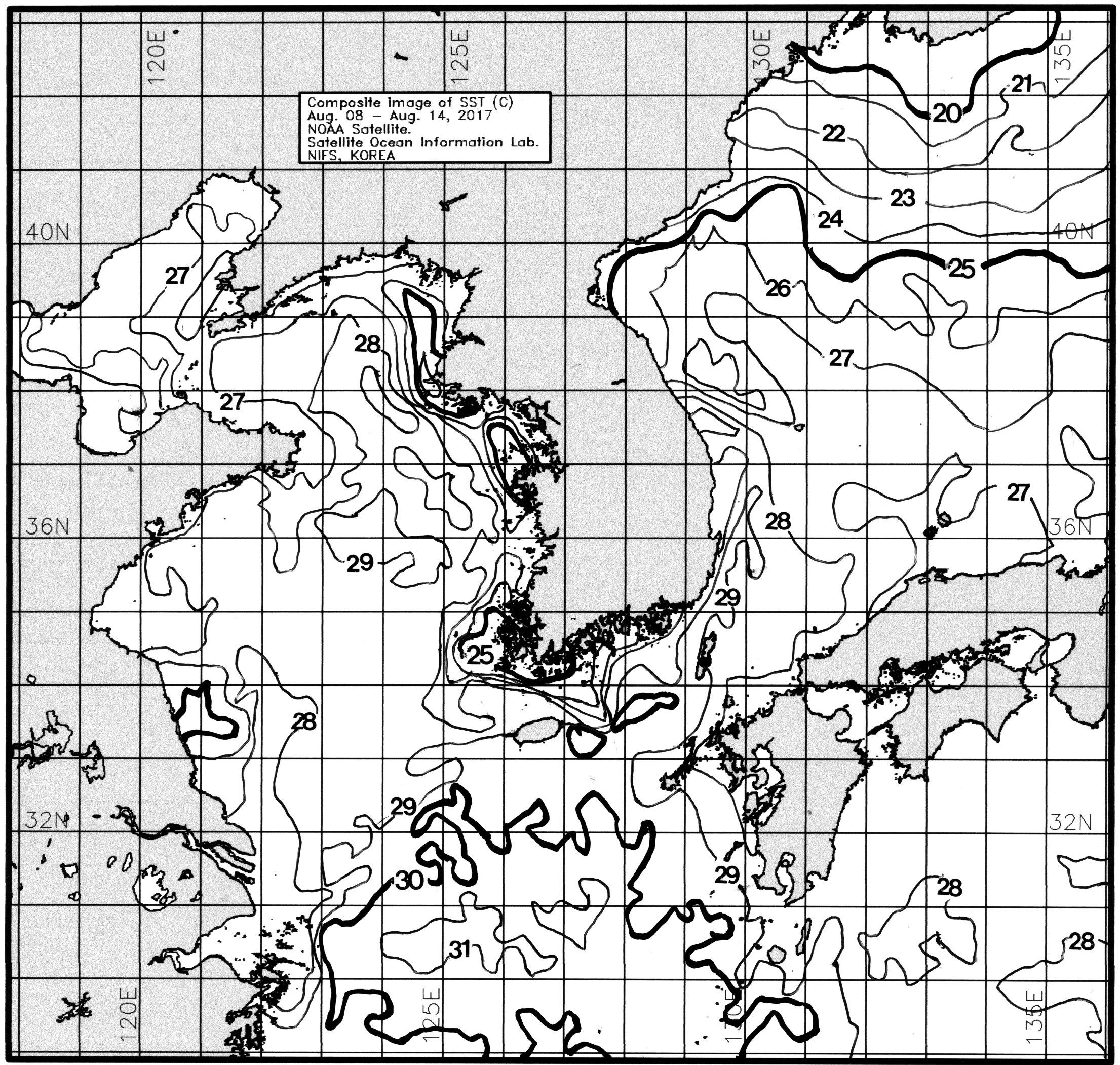 ○ 금주(2017.08.20~2017.08.26)의 한국근해 표면수온은 대화퇴 근해 섭씨 26~28도, 울릉도-독도 근해 28~29도, 대마도 근해 29~30도, 제주도 근해 29~30도, 이어도 근해 29~30도, 가거초 근해 29~30도, 어청도 근해 28~29도, 백령도 근해 26∼27도 내외로 예상됩니다. 광역 위성영상 합성 표면수온 분포도 (2017. 08. 08 ~ 2017. 08. 14)