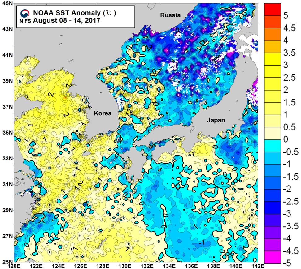 ○ 「평년에 비해」 대화퇴 근해 3도 높게, 울릉도-독도 4도 높게, 대마도 2.5도 높게, 제주도 근해 2.5도 높게, 이어도 근해 2도 높게, 가거초 근해 3.5도 높게, 어청도 근해 3.5도 높게 나타날 것으로 예상됩니다. NOAA 위성영상 표면수온 평년편차 분포도 (2017. 08. 08 ~ 2017. 08. 14)