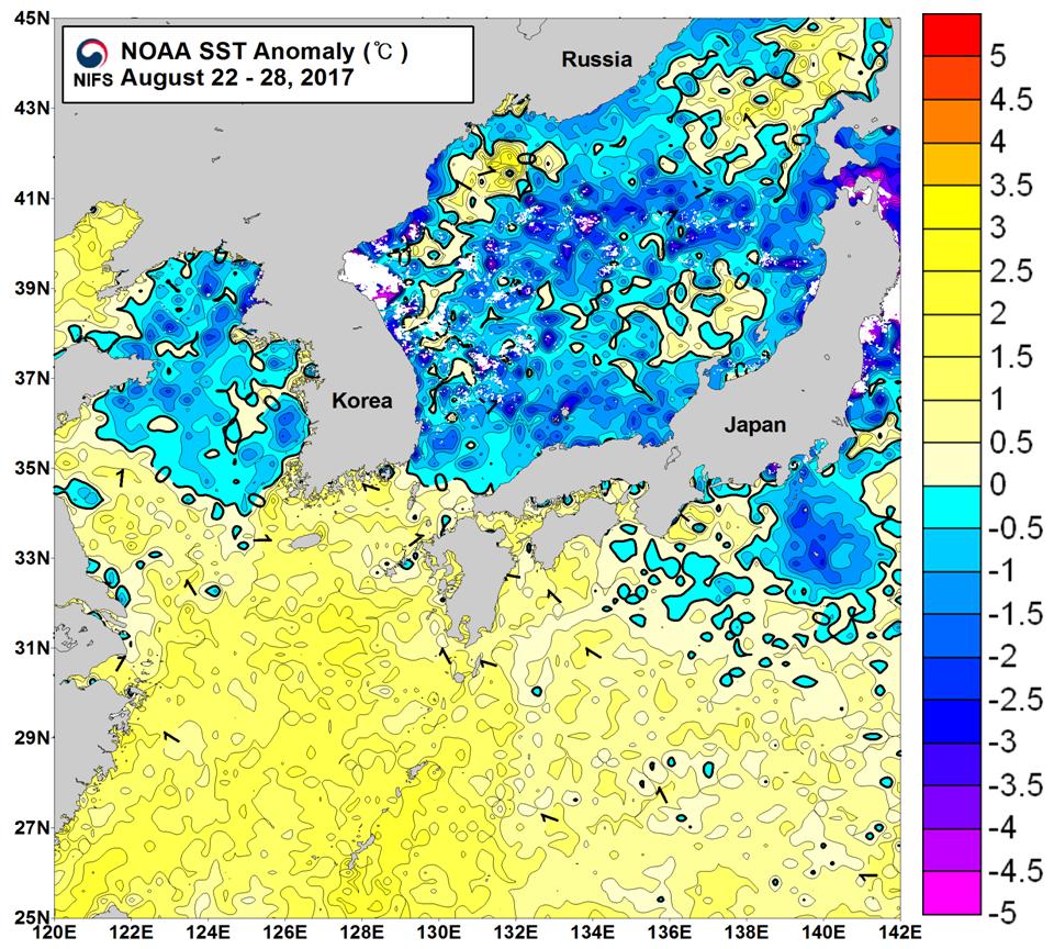 ○ 「평년에 비해」 대화퇴 근해 1.5도 낮게, 울릉도-독도 1도 낮게, 대마도 비슷하게, 제주도 근해 0.5도 높게, 이어도 근해 1도 높게, 가거초 근해 0.5도 높게, 어청도 근해 1.5도 낮게 나타날 것으로 예상됩니다. NOAA 위성영상 표면수온 평년편차 분포도 (2017. 08. 22 ~ 2017. 08. 28) ※ 위 그림은 NOAA 위성에서 관측한 한반도 주변해역 표면수온 영상의 평년(1990-2016년) 에 대한 편차 분포를 나타냅니다.