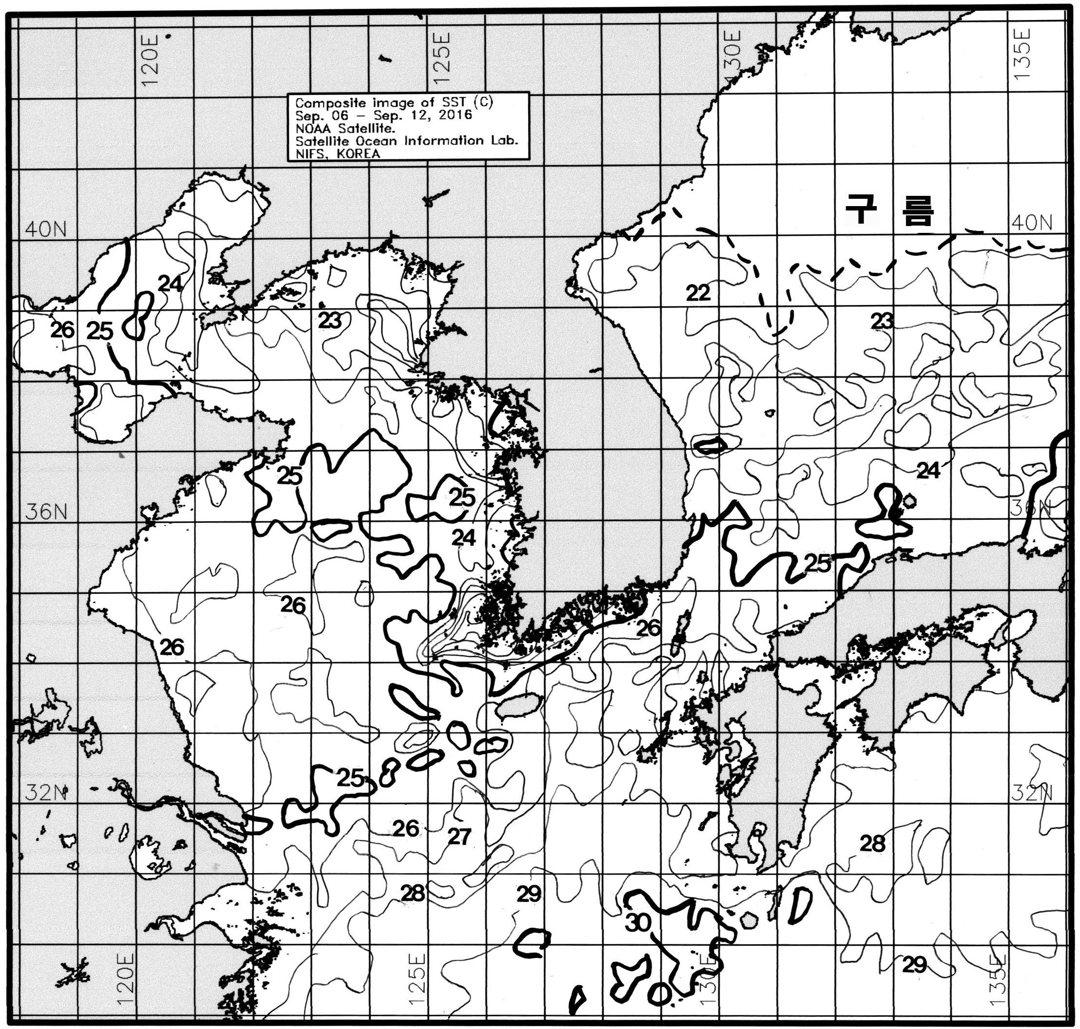 ○ 「작년(2016. 08. 30 ~ 2016. 09. 05)에 비해」 대화퇴 근해 0.5도 낮게, 울릉도-독도 근해 0.5도 낮게, 대마도 비슷하게, 제주도 근해 0.5도 높게, 이어도 근해 2도 높게, 가거초 1.5도 높게, 어청도 2도 낮게, 백령도 근해 0.5도 낮게 나타날 것으로 예상됩니다. 광역 위성영상 합성 표면수온 분포도 (2016. 09. 06 ~ 2016. 09. 12)