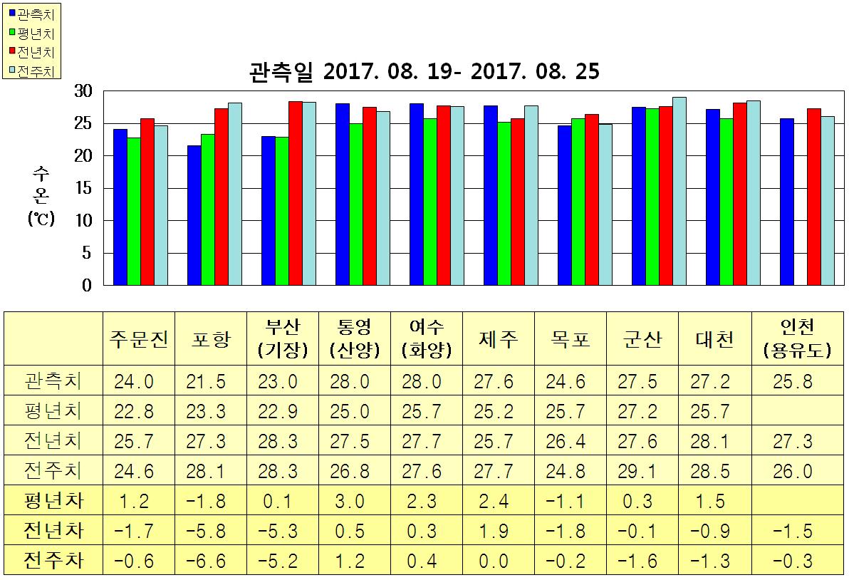 Ⅱ.한국 연안 수온정보 ○ 금주(2017.09.03~2017.09.09)의 한반도 연안 표면수온은 동해 연안역에서 섭씨 22~24도, 남해 연안역에서 24~25.5도, 서해 연안역에서 24~25도 내외로 예상됩니다. ○ 평년에 비해 주문진 비슷함을 제외한 동해 연안역은 0.5~1.0도 높게, 제주 0.5~1도 낮음을 제외한 남해 연안역은 0.5~1.0도 높게, 목포 0.5~1도 낮음을 제외한 서해 연안역은 비슷하게 나타날 것으로 예상됩니다. ○ 전년에 비해 주문진 비슷함을 제외한 동해 연안역은 0.5~1.0도 낮게, 제주 0.5~1.0도 높음을 제외한 남해 연안역은 비슷하게, 목포 0.5~1.0도 낮음, 군산 1.0~1.5도 낮음을 제외한 서해 연안역은 비슷하게 나타날 것으로 예상됩니다.