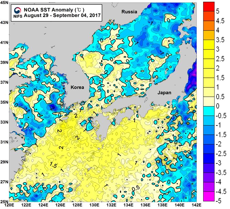 ○ 「평년에 비해」 대화퇴 근해 0.5도 낮게, 울릉도-독도 0.5도 높게, 대마도 0.5도 높게, 제주도 근해 1도 높게, 이어도 근해 1도 높게, 가거초 근해 1도 낮게, 어청도 근해 1도 낮게 나타날 것으로 예상됩니다. NOAA 위성영상 표면수온 평년편차 분포도 (2017. 08. 29 ~ 2017. 09. 04) ※ 위 그림은 NOAA 위성에서 관측한 한반도 주변해역 표면수온 영상의 평년(1990-2016년) 에 대한 편차 분포를 나타냅니다.