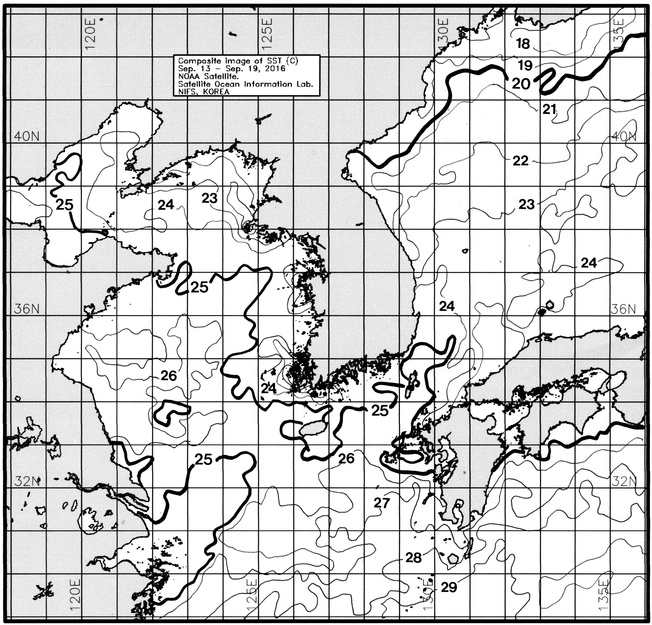 ○ 「작년(2016. 09. 13 ~ 2016. 09. 19)에 비해」 대화퇴 근해 1도 낮게, 울릉도-독도 근해 0.5도 높게, 대마도 1도 높게, 제주도 근해 1도 높게, 이어도 근해 1.5도 높게, 가거초 2도 낮게, 어청도 2.5도 낮게, 백령도 근해 1도 높게 나타날 것으로 예상됩니다. 광역 위성영상 합성 표면수온 분포도 (2016. 09. 13 ~ 2016. 09. 19)