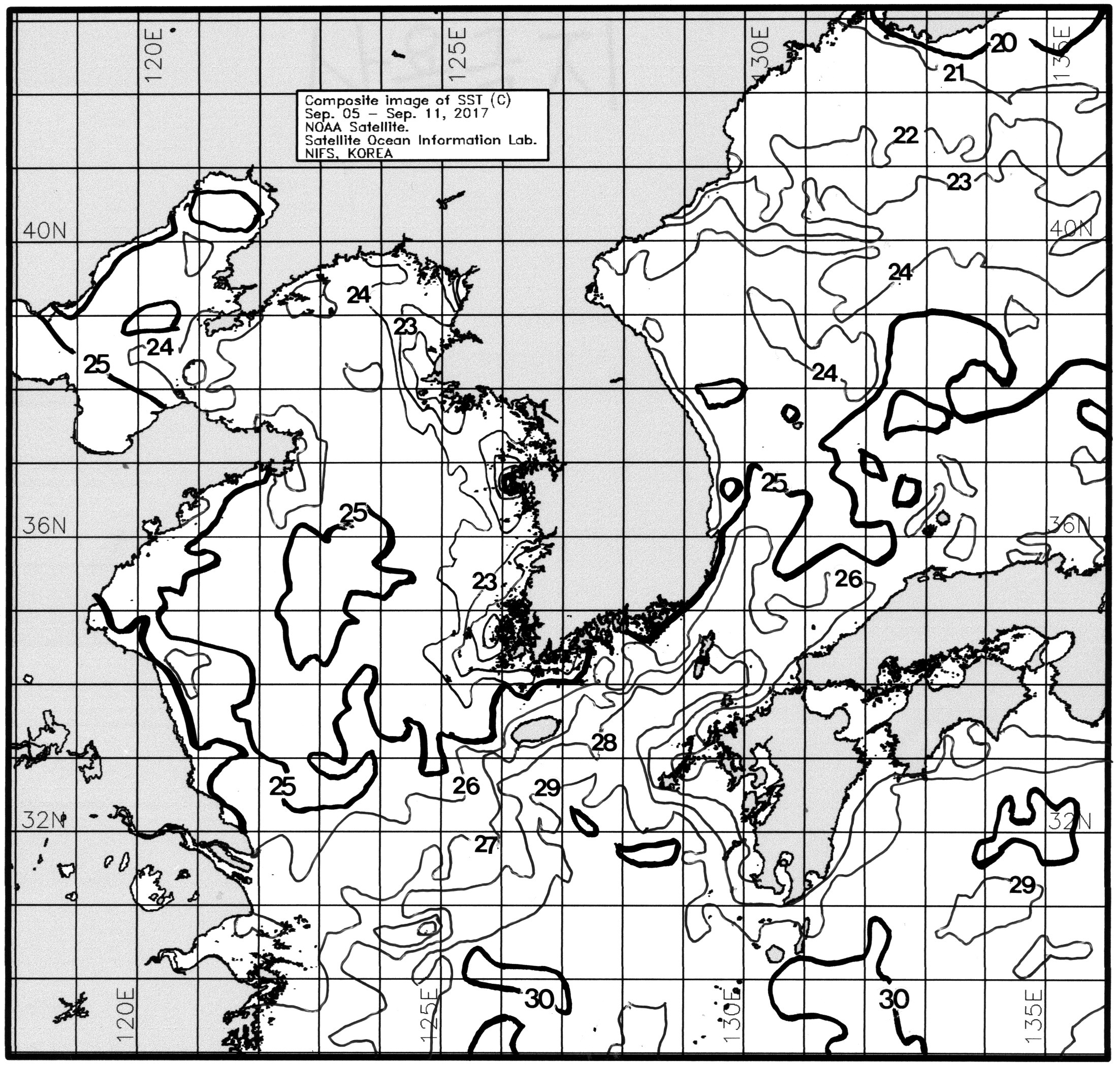 I. 위성관측 한국 근해 표면수온 정보 ○ 금주(2017.09.17~2017.09.23)의 한국근해 표면수온은 대화퇴 근해 섭씨 21~23도, 울릉도-독도 근해 23~25도, 대마도 근해 25~27도, 제주도 근해 25~26도, 이어도 근해 25~26도, 가거초 근해 22~24도, 어청도 근해 21~23도, 백령도 근해 20∼22도 내외로 예상됩니다. 광역 위성영상 합성 표면수온 분포도 (2017. 09. 05 ~ 2017. 09. 11)