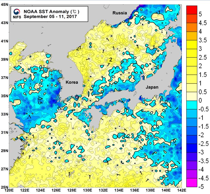 ○ 「평년에 비해」 대화퇴 근해 비슷하게, 울릉도-독도 0.5도 높게, 대마도 0.5도 높게, 제주도 근해 0.5도 높게, 이어도 근해 0.5도 낮게, 가거초 근해 1도 낮게, 어청도 근해 1도 낮게 나타날 것으로 예상됩니다. NOAA 위성영상 표면수온 평년편차 분포도 (2017. 09. 05 ~ 2017. 09. 11)
