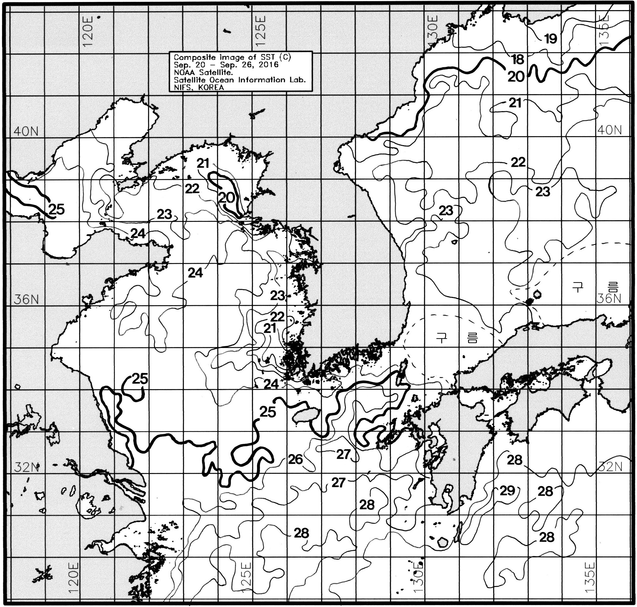 ○ 「작년(2016. 09. 20 ~ 2016. 09. 26)에 비해」 대화퇴 근해 0.5도 낮게, 울릉도-독도 근해 1도 높게, 대마도 2도 높게, 제주도 근해 0.5도 높게, 이어도 근해 0.5도 높게, 가거초 1도 낮게, 어청도 0.5도 낮게, 백령도 근해 비슷하게 나타날 것으로 예상됩니다. 광역 위성영상 합성 표면수온 분포도 (2016. 09. 20 ~ 2016. 09. 26)