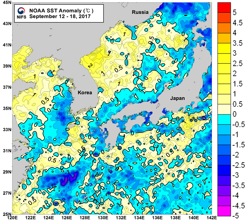 ○ 「평년에 비해」 대화퇴 근해 0.5도 낮게, 울릉도-독도 1도 높게, 대마도 0.5도 낮게, 제주도 근해 0.5도 높게, 이어도 근해 비슷하게, 가거초 근해 0.5도 낮게, 어청도 근해 0.5도 낮게 나타날 것으로 예상됩니다. NOAA 위성영상 표면수온 평년편차 분포도 (2017. 09. 12 ~ 2017. 09. 18)