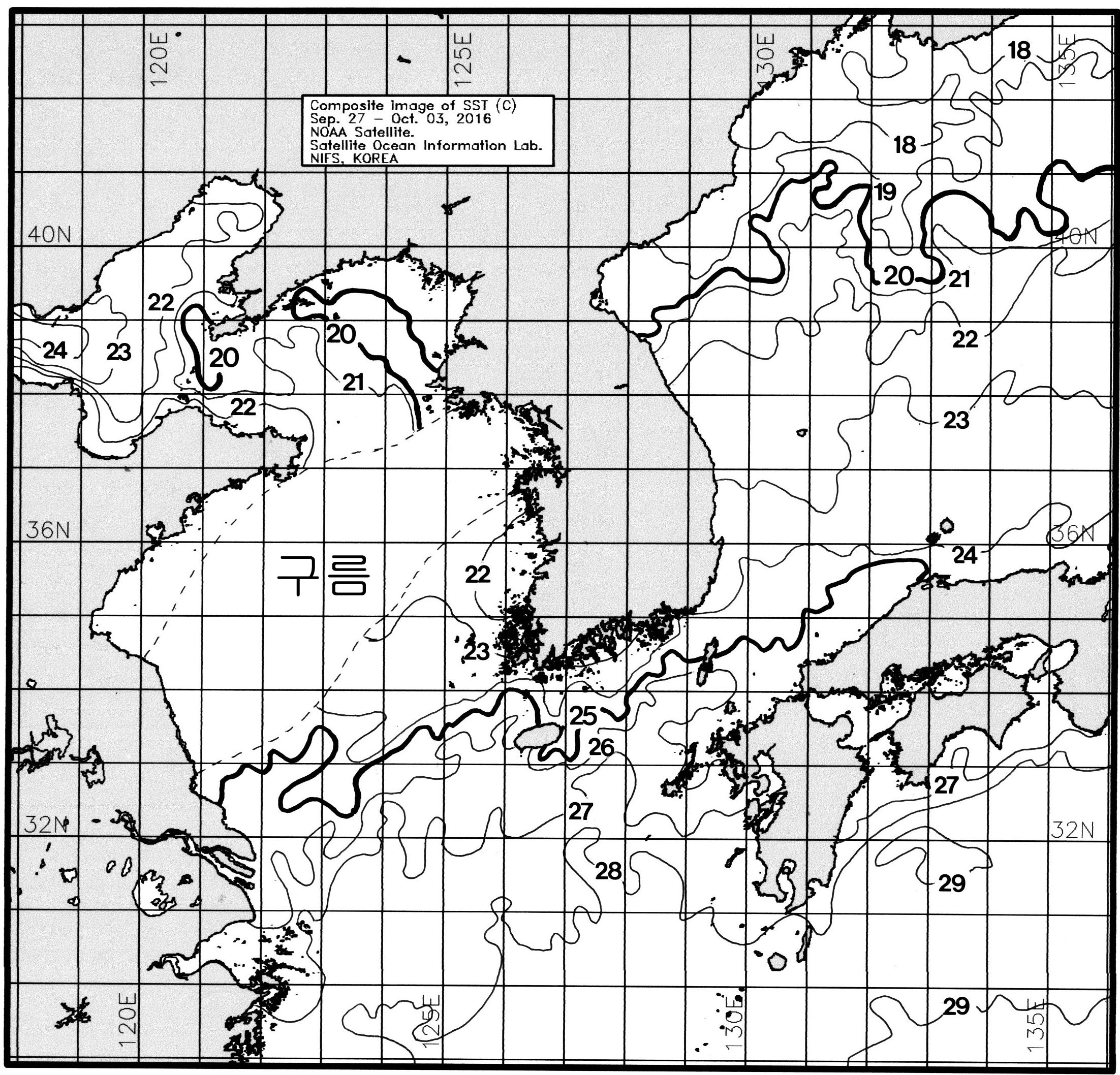 ○ 「작년(2016. 09. 27 ~ 2016. 10. 03)에 비해」 대화퇴 근해 1도 낮게, 울릉도-독도 근해 1도 높게, 대마도 0.5도 낮게, 제주도 근해 0.5도 높게, 이어도 근해 1.5도 낮게, 가거초 0.5도 낮게, 어청도 1도 낮게, 백령도 근해 0.5도 높게 나타날 것으로 예상됩니다. 광역 위성영상 합성 표면수온 분포도 (2016. 09. 27 ~ 2016. 10. 03)