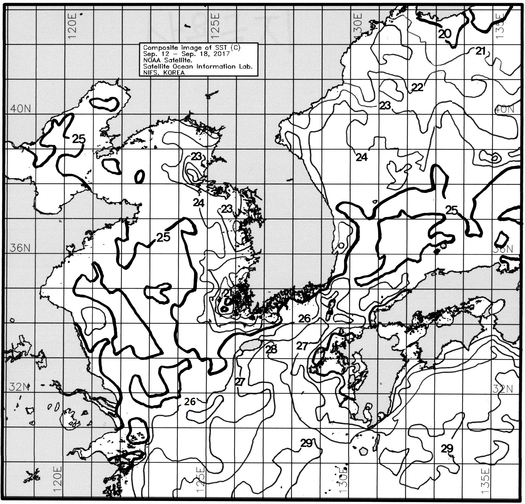 ○ 금주(2017.09.24~2017.09.30)의 한국근해 표면수온은 대화퇴 근해 섭씨 20~22도, 울릉도-독도 근해 23~24도, 대마도 근해 24~25도, 제주도 근해 25~26도, 이어도 근해 24~26도, 가거초 근해 22~24도, 어청도 근해 20~22도, 백령도 근해 19∼21도 내외로 예상됩니다. 광역 위성영상 합성 표면수온 분포도 (2017. 09. 12 ~ 2017. 09. 18)