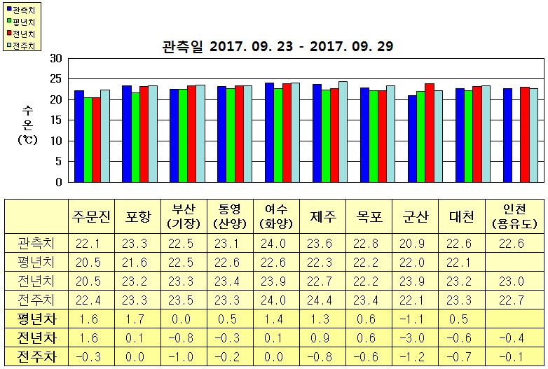 Ⅱ.한국 연안 수온정보 ○ 금주(2017.10.08~2017.10.14)의 한반도 연안 표면수온은 동해 연안역에서 섭씨 19.5~21.5도, 남해 연안역에서 21~22도, 서해 연안역에서 19.0~20.5도 내외로 예상됩니다. ○ 평년에 비해 부산(기장) 비슷함을 제외한 동해 연안역은 1.0~1.5도 높게, 남해 연안역은 0.5~1.0도 높게, 군산 0.5도 낮음을 제외한 서해 연안역은 0.5~1.0도 높게 나타날 것으로 예상됩니다. ○ 전년에 비해 주문진 2도 높음을 제외한 동해 연안역은 비슷하게, 남해 연안역은 제주 1.5도 높게, 통영(산양) 0.5도 낮게, 여수(화양) 비슷하게, 목포 비슷함을 제외한 서해 연안역은 0.5~1.5도 낮게 나타날 것으로 예상됩니다.