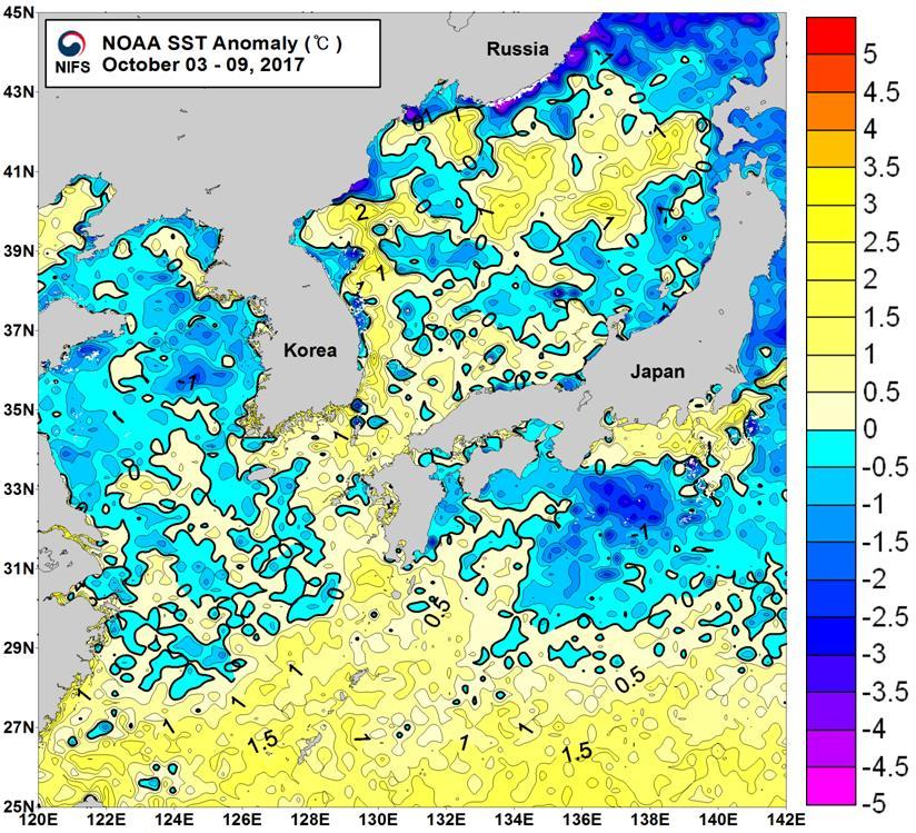 ○ 「평년에 비해」 대화퇴 근해 0.5도 높게, 울릉도-독도 0.5도 낮게, 대마도 0.5도 높게, 제주도 근해 0.5도 낮높게, 이어도 근해 0.5도 높게, 가거초 근해 1도 낮게, 어청도 근해 0.5도 낮게 나타날 것으로 예상됩니다. NOAA 위성영상 표면수온 평년편차 분포도 (2017. 10. 03 ~ 2017. 10. 09)