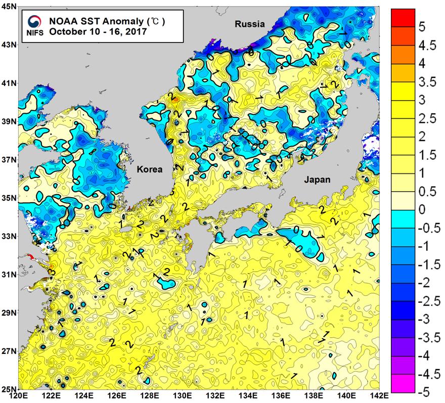 ○ 「평년에 비해」 대화퇴 근해 0.5도 높게, 울릉도-독도 0.5도 높게, 대마도 1.5도 높게, 제주도 근해 1도 높게, 이어도 근해 1.5도 높게, 가거초 근해 비슷하게, 어청도 근해 0.5도 낮게 나타날 것으로 예상됩니다. NOAA 위성영상 표면수온 평년편차 분포도 (2017. 10. 10 ~ 2017. 10. 16)