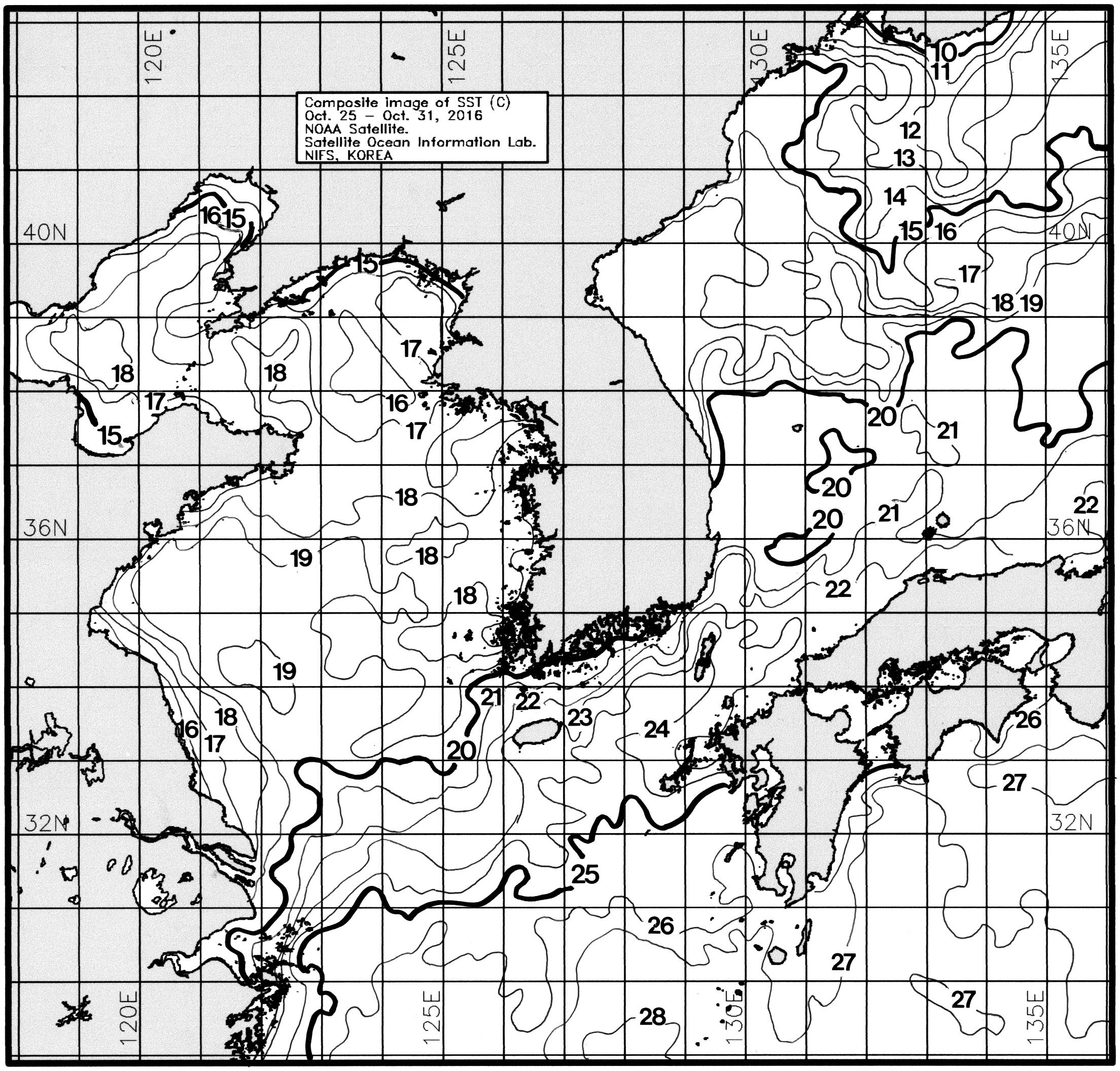 ○ 금주(2017.10.22~2017.10.28)의 한국근해 표면수온은 대화퇴 근해 섭씨 18~19도, 울릉도-독도 근해 19~21도, 대마도 근해 23~25도, 제주도 근해 22~24도, 이어도 근해 23~24도, 가거초 근해 18~20도, 어청도 근해 16~18도, 백령도 근해 15∼17도 내외로 예상됩니다. ○ 수온 전선대는 제주해협-대한해협 근해를 걸쳐 수온 22도를 중심으로 형성 될 것으로 예상됩니다. 광역 위성영상 합성 표면수온 분포도 (2017. 10. 10 ~ 2017. 10. 16)