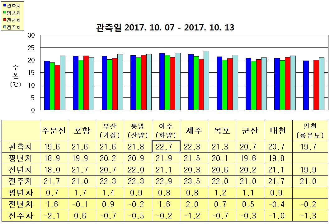 ○ 금주(2017.10.22~2017.10.28)의 한반도 연안 표면수온은 동해 연안역에서 섭씨 17.5~20.0도, 남해 연안역에서 19.5~20.5도, 서해 연안역에서 18~19도 내외로 예상됩니다. ○ 평년에 비해 동해 연안역은 0.5~1.5도 높게, 제주 0.5~1.0도 낮음을 제외한 남해 연안역은 비슷하게, 서해 연안역은 0.5~1.0도 높게 나타날 것으로 예상됩니다. ○ 전년에 비해 부산(기장) 비슷함, 포항 0.5~1.0도 낮음을 제외한 동해 연안역은 1.0~1.5도 높게, 여수 0.5~1.0도 높음을 제외한 남해 연안역은 비슷하게, 서해 연안역은 0.5~1.5도 높게 나타날 것으로 예상됩니다.