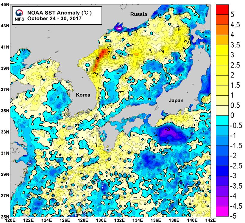 NOAA 위성영상 표면수온 평년편차 분포도 (2017. 10. 24 ~ 2017. 10. 30)