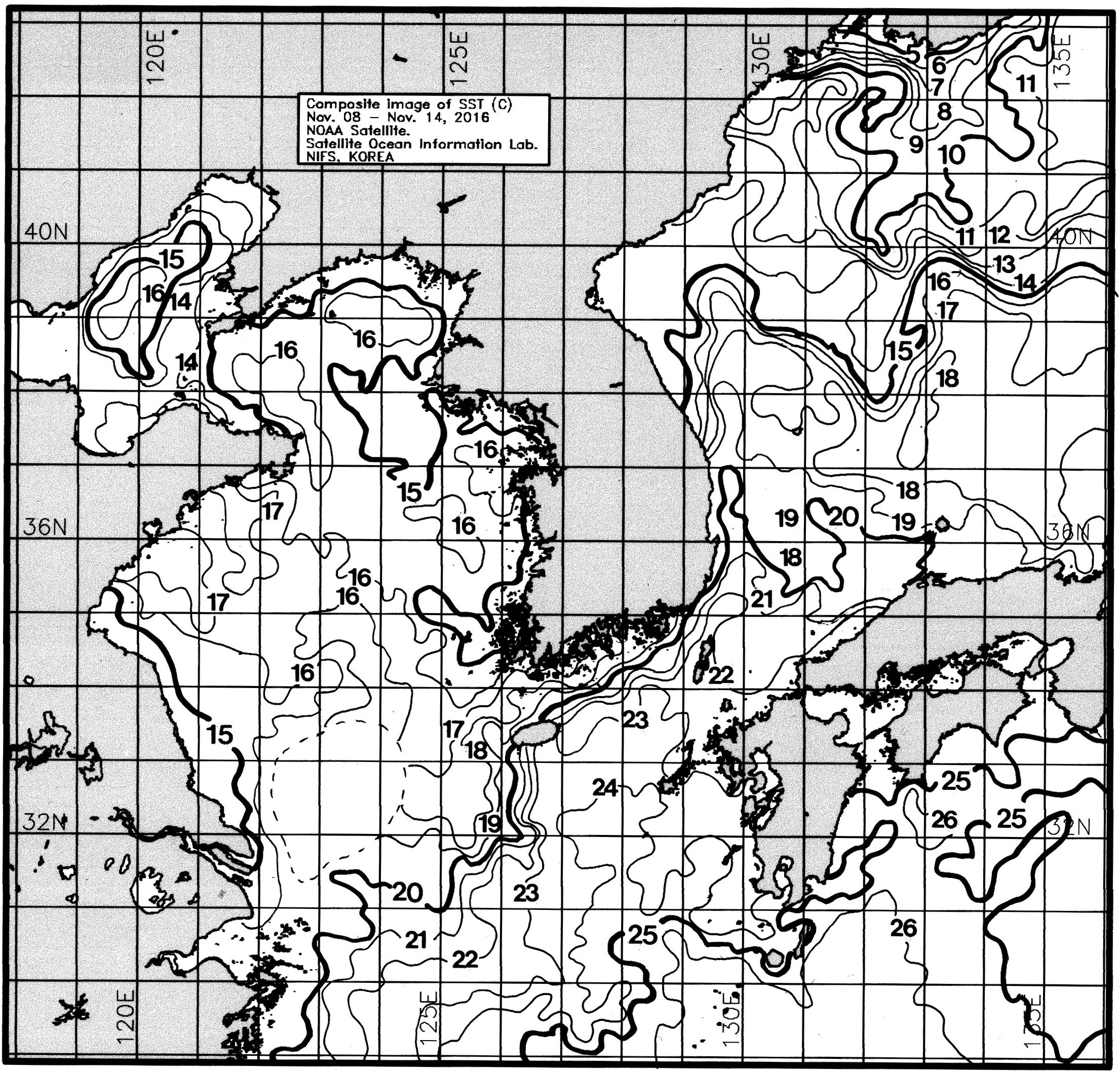 광역 위성영상 합성 표면수온 분포도 (2016. 11. 08 ~ 2016. 11. 14)