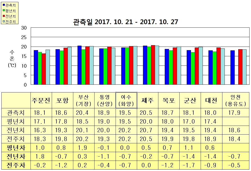○ 금주(2017.11.05~2017.11.11)의 한국근해 표면수온은 대화퇴 근해 섭씨 16~17도, 울릉도-독도 근해 18~19도, 대마도 근해 21~23도, 제주도 근해 21~22도, 이어도 근해 22~23도, 가거초 근해 18~19도, 어청도 근해 14~16도, 백령도 근해 15∼16도 내외로 예상됩니다. ○ 수온 전선대는 제주해협-대한해협 근해를 걸쳐 수온 21도를 중심으로 형성 될 것으로 예상됩니다.