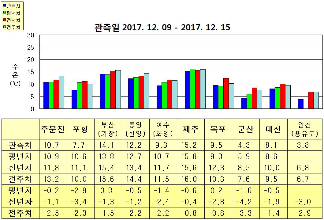 ○ 금주(2017.12.24~2017.12.30)의 한반도 연안 표면수온은 동해 연안역에서 섭씨 8~12도, 남해 연안역에서 8.5~14.5도, 서해 연안역에서 3.5~7.5도 내외로 예상됩니다. ○ 평년에 비해 동해 연안역은 1~2도 낮게, 남해 연안역은 0.5~1.0도 낮게, 대천 0.5~1.0도 낮음을 제외한 서해 연안역은 비슷하게 나타날 것으로 예상됩니다. ○ 전년에 비해 동해 연안역은 1.0~3.5도 낮게, 남해 연안역은 1~2도 낮게, 서해 연안역은 1.5~4.0도 낮게 나타날 것으로 예상됩니다.