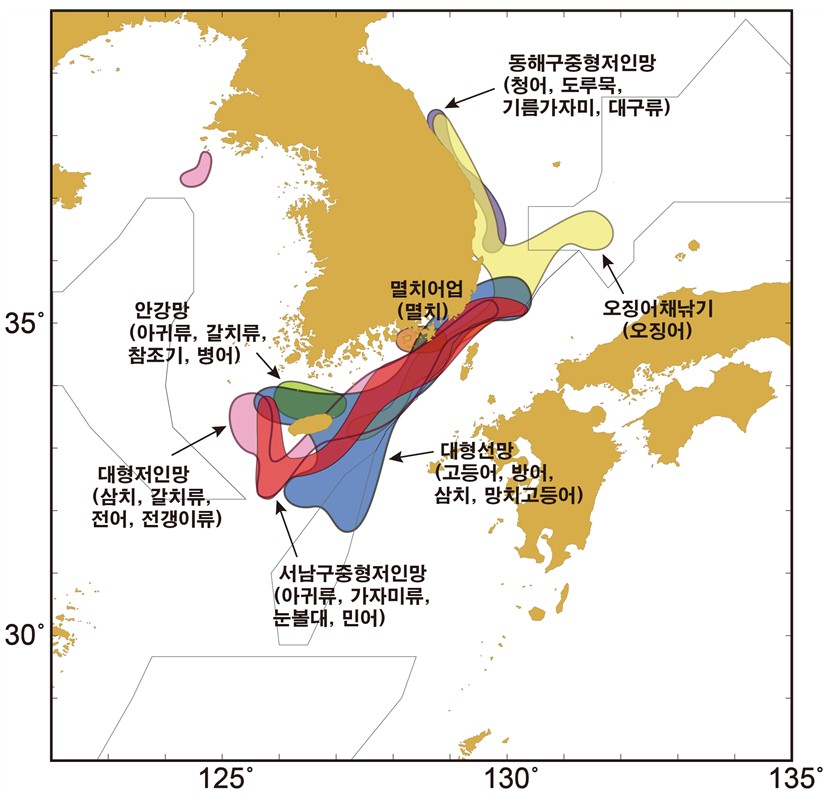 ○ 근해안강망어업 1월 근해안강망어업은 제주 북부 근해~서해 남부 근해에 걸쳐, 아귀류(25%), 병어(20%), 갈치(16%), 참조기(7%) 등을 대상으로 어장이 형성되었으며, 전체적인 어황은 평년비 부진하였다. 2월에 들면 근해안강망어업은 황해저층냉수와 연안수 및 황해난류에 의한 수온전선대가 형성되는 서해 남부해역과 제주도 북서부 해역에서 중심어장이 형성되겠으며, 갈치, 아귀류, 반지, 병어 등의 어군이 형성될 것으로 전망된다. 전체적인 어황은 평년수준 또는 평년비 부진할 것으로 예상된다. ○ 저인망어업 1월의 대형저인망어업은 쌍끌이어업이 제주 서부해역을 중심으로 어장이 형성되어 삼치(24%), 갈치(15%), 전갱이(14%), 병어(11%), 말쥐치(11%) 등을 어획하였다. 대형외끌이저인망어업은 제주 남부~북동부 근해에 걸쳐 갑오징어류(13%), 참돔(10%), 넙치(9%), 보구치(8%), 아귀류(8%) 등을 대상으로 조업하였다. 서남구중형외끌이어업은 제주 남서부 근해~동해 남부 근해에 걸쳐 가자미류(28%), 아귀류(11%), 갑오징어류(10%), 넙치(7%), 민어(7%) 등을 대상으로 어장이 형성되었고, 동해구중형외끌이어업은 강원·경북 연근해에서 청어(68%), 기름가자미(12%), 도루묵(11%), 살오징어(2%)등을 어획하였다. 저인망어업의 전체적인 어황은 평년비 부진하였다. 2월에 들면 쌍끌이대형저인망어업은 삼치, 갈치, 전어 등을 대상으로 제주 서부해역~북동부해역을 중심으로 어장이 형성되겠고, 서해 특정해역에서도 홍어, 아귀를 대상으로 일부어장이 형성되겠다. 대형외끌이저인망어업은 제주 서부근해~제주 남동부 및 남해 중부해역에 걸쳐 아귀류, 갑오징어류, 참돔, 쥐치류, 가자미류 등을 대상으로 어장이 형성되겠다. 서남구중형저인망어업은 아귀류, 가자미류, 눈볼대, 민어, 보구치 등을 대상으로 제주 서남부 근해~동해 남부 해역에 걸쳐 조업이 이루어질 것으로 예상된다. 동해구외끌이중형저인망어업은 동해 연·근해을 중심으로 청어, 도루묵, 대구, 살오징어, 기름가자미 등을 대상으로 조업하겠다. 저인망어업의 전체적인 어황은 평년수준 또는 평년비 부진할 것으로 전망된다. ○ 오징어채낚기어업 1월의 오징어채낚기어업은 동해 중·남부 연근해에서 조업하였고, 전체적인 어황은 평년비 크게 부진(68%↓) 하였다. 2월에 들면 오징어채낚기어업은 계절적으로 남하하는 어군들을 대상으로 경북 근해와 남해 동부 근해에서 일부어장이 형성되겠다. 전체적인 어황은 평년비 부진이 이어질 것으로 전망된다.