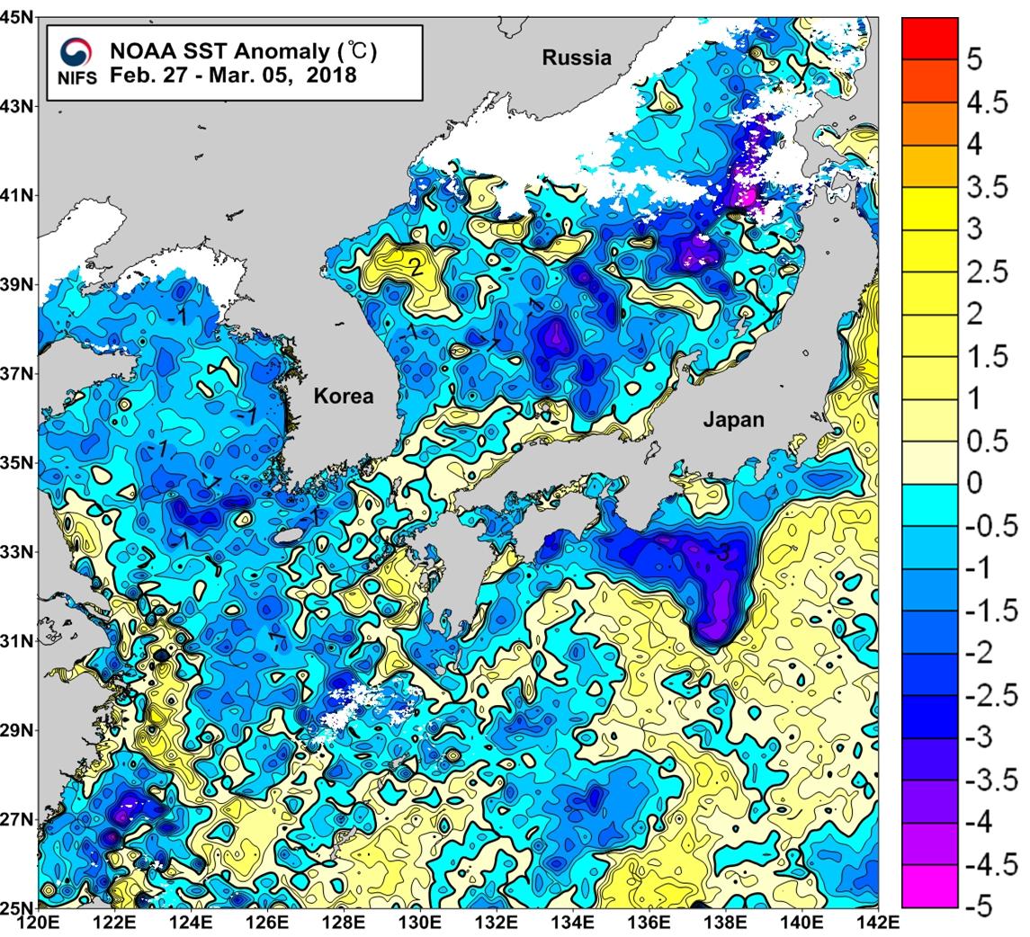 NOAA 위성영상 표면수온 평년편차 분포도 (2018. 02. 27 ~ 2018. 03. 05)