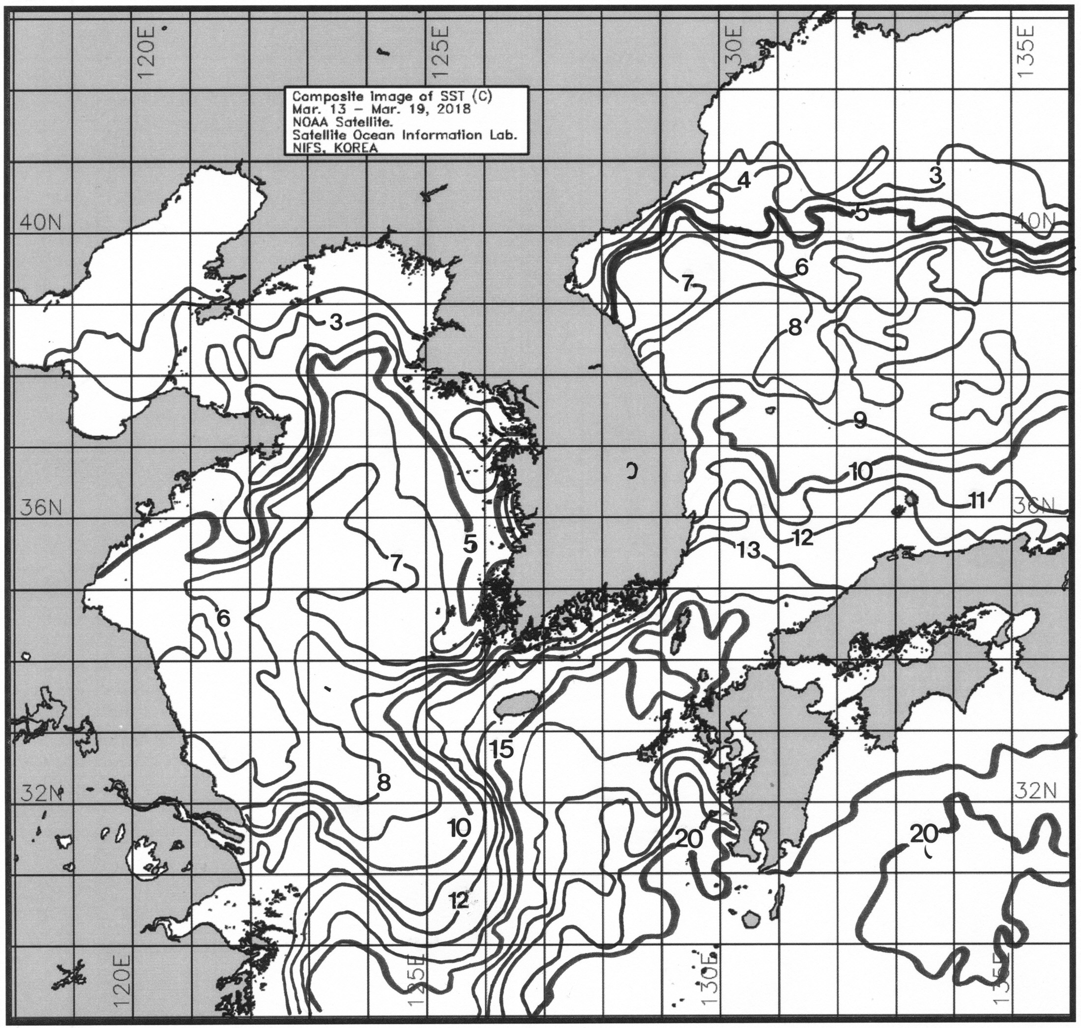○ 금주(2018.03.25~2018.03.31)의 한국근해 표면수온은 대화퇴 근해 섭씨 7~9, 울릉도-독도 근해 10~11도, 대마도 근해 14~16도, 제주도 근해 14~16도, 이어도 근해 8~10도, 가거초 근해 7~9도, 어청도 근해 4~6도, 백령도 근해 4∼6도 내외로 예상됩니다. ○ 수온 전선대는 제주해협-대한해협 근해를 걸쳐 수온 14도를 중심으로 형성 될 것으로 예상됩니다.