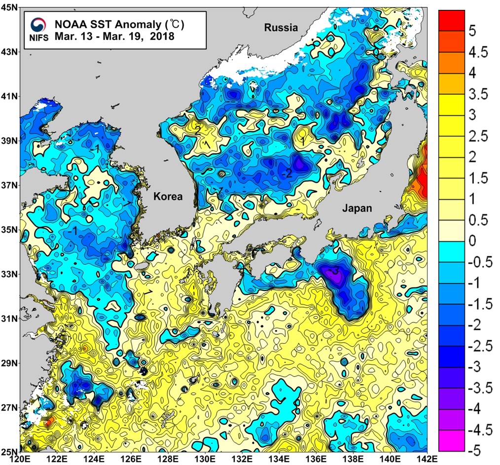NOAA 위성영상 표면수온 평년편차 분포도 (2018. 03. 13 ~ 2018. 03. 19)