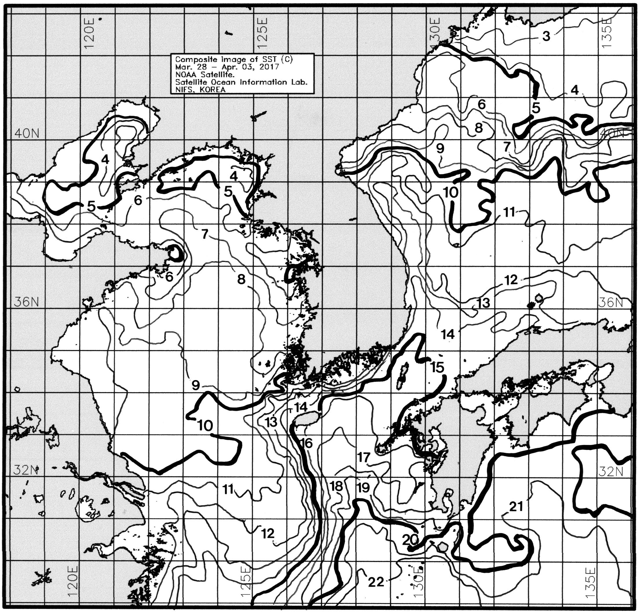 광역 위성영상 합성 표면수온 분포도 (2017. 03. 28 ~ 2017. 04. 03)